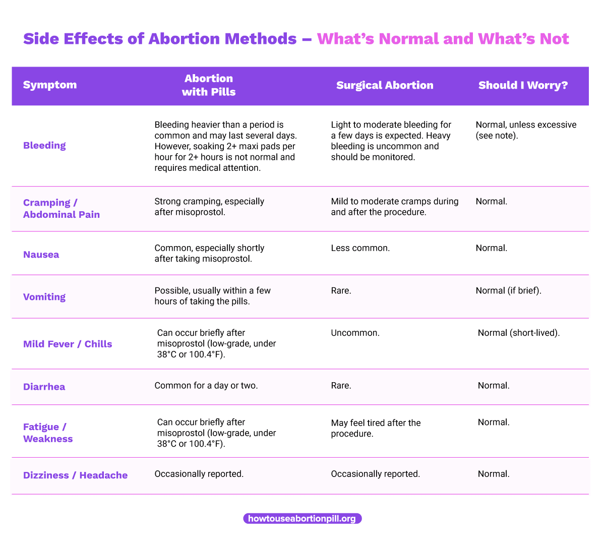 In most cases, abortion—whether with pills or a procedure—is very safe. But just like with any health process, it’s important to know when to reach out for help. While complications are rare, you should contact a healthcare provider immediately if you experience: