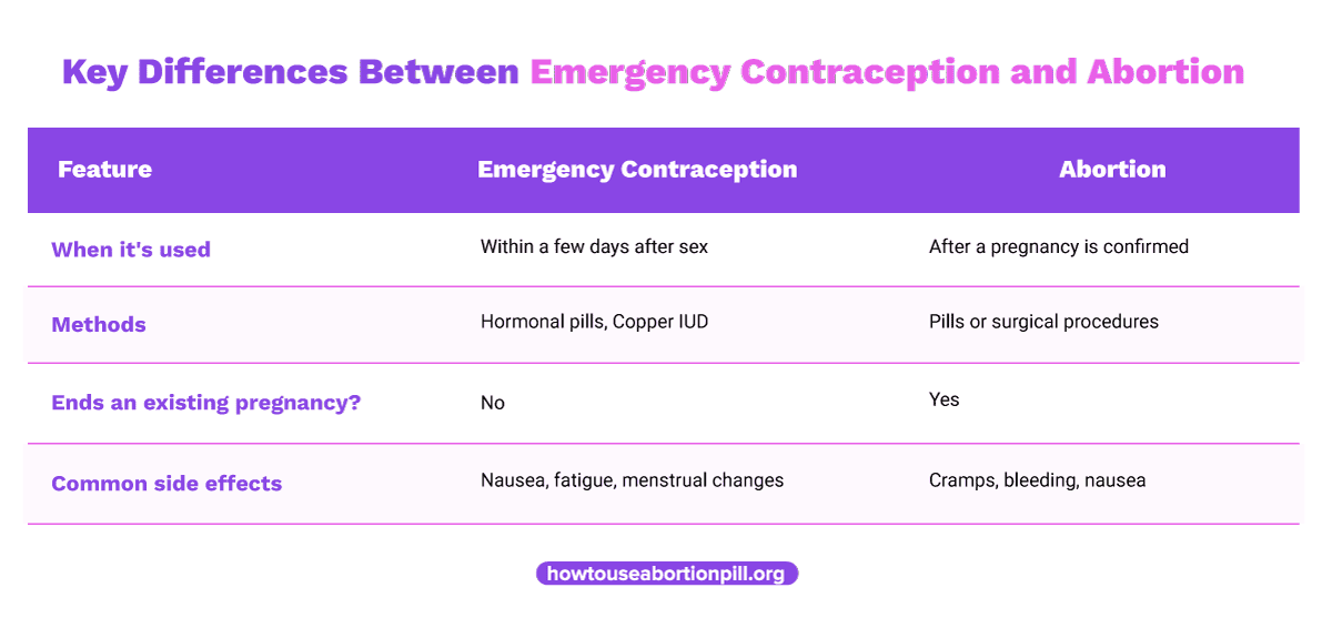 Emergency contraception (EC) works before a pregnancy starts—it helps prevent it. Abortion, on the other hand, is a procedure that ends an existing pregnancy.